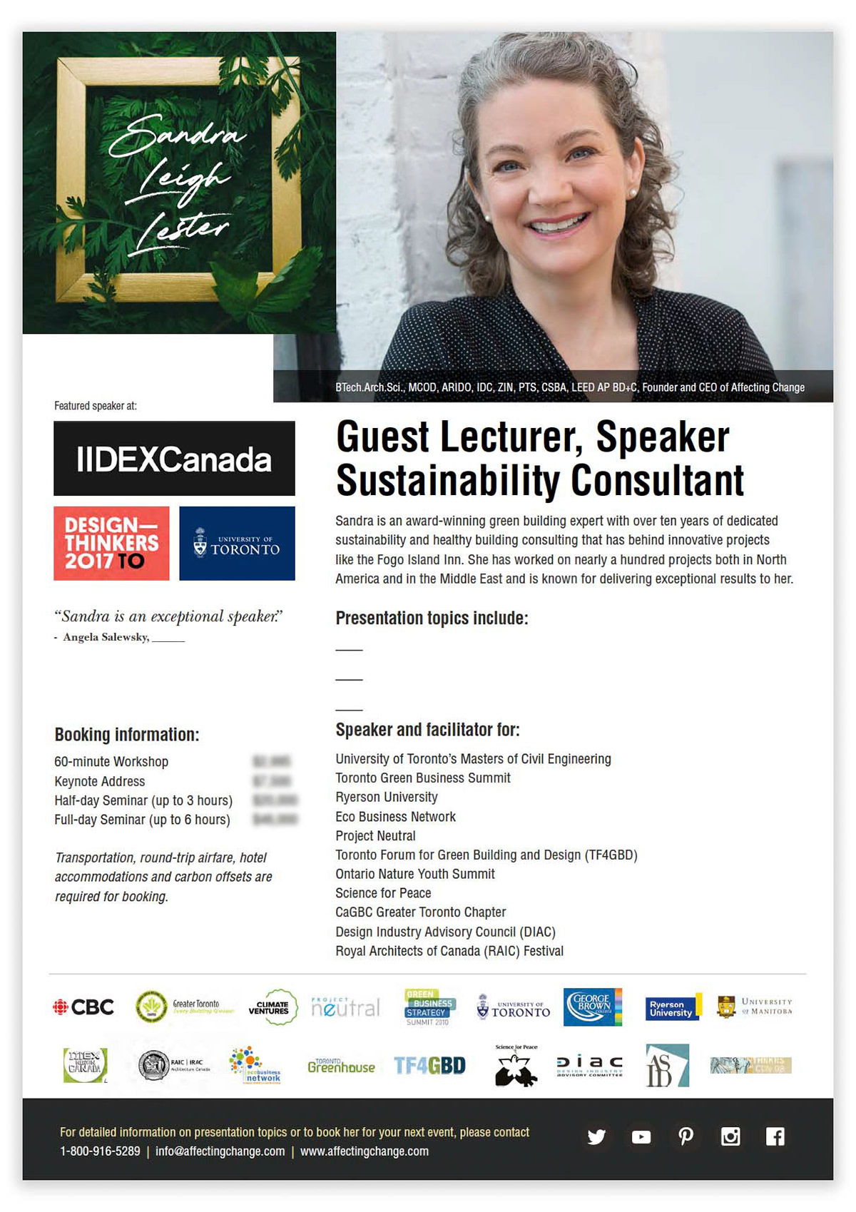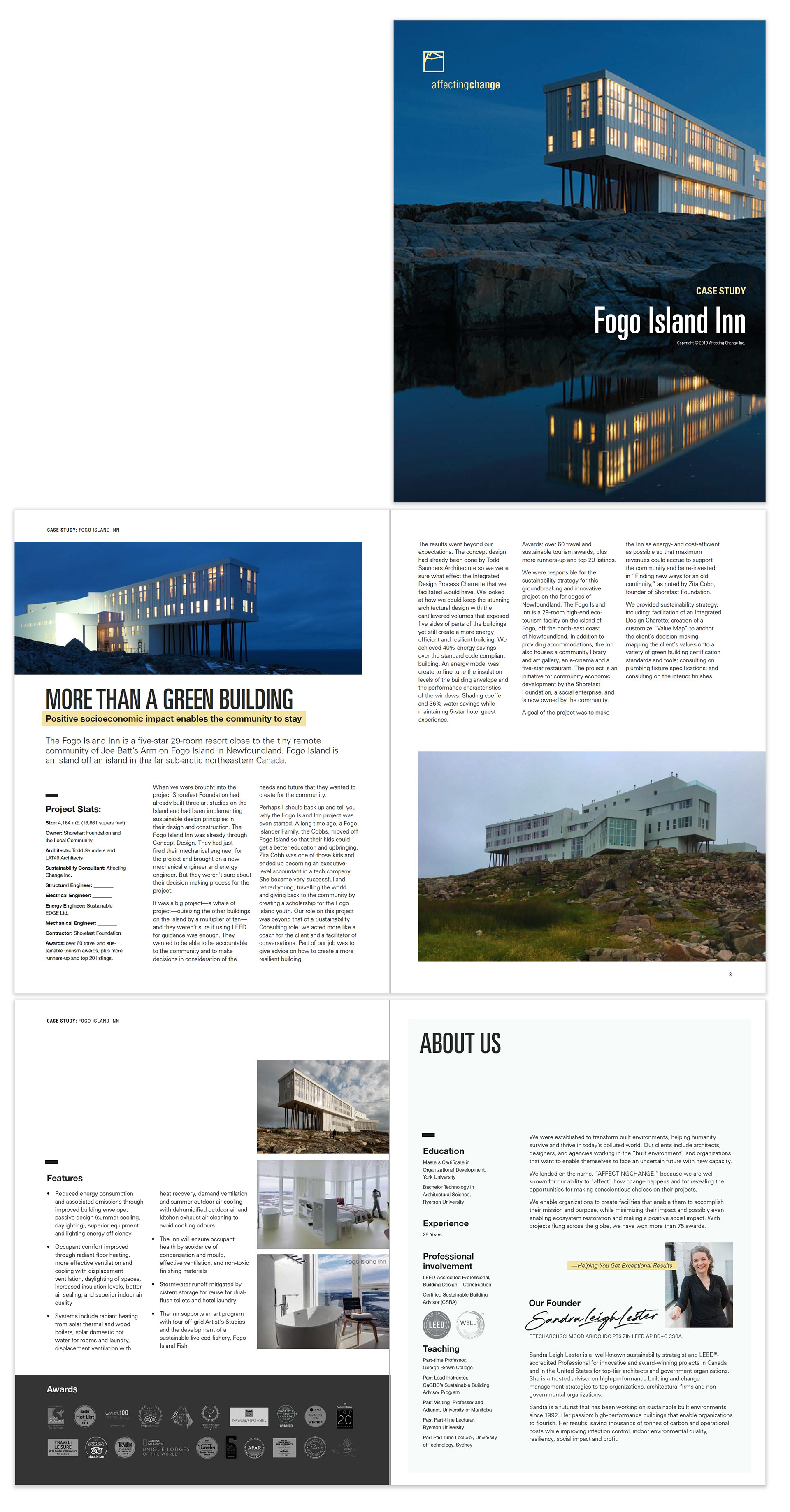 Affecting Change is a sustainability consultant firm found by Sandra L. Laster, who is a true expert in her field. Our brief was to make the brand more approachable. The problem with the old branding was that it was cold and very scientific. Sandra also used the word 'interventionist' for herself which was not inviting for her target audience. In fact, what she was actually doing was making buildings healthier for the environment and for their habitants by questioning the common logic. She is basically looking at things from a different perspective. To communicate this message we simply, we reversed the Fogo Island photo upside down, so that the water reflection is on the top, and added the tag line "We Look at Buildings Differently". We aligned My Green Reno logo with the Affecting Change logo, which was beautifully designed. We also brought more colours to her site by adding fresh icons and striking environmental imagery that communicates Sandra's true personality and passion for the environment. We re-designed templates for case-studies and educational decks as you will see bellow.